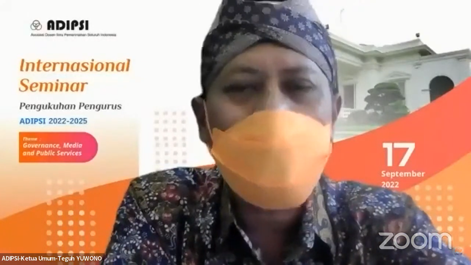 Semarang (19/9) – The Study Program of Government Studies, Faculty of Social and Political Sciences, Universitas Diponegoro along with the Association of Indonesian Government Studies Lecturers (Asosiasi Dosen Ilmu Pemerintahan Seluruh Indonesia / ADIPSI) recently held an International Seminar that discussed Government, Media & Public Services as well as the Inauguration of ADIPSI Management for the 2022 – 2025 period. The activity, which took place online through the Zoom meeting, was held on Saturday, September 17, 2022 and presented several speakers from within and outside the country. They were Prof. Vandana Pednekar-Magal (Grand Valley State University), Prof. Dyah Mutiarini, S.IP., M. Si. (University of Muhammadiyah Yogyakarta), and Afrizal Sintong, S.I.P. (Regent of Rokan Hilir Riau).